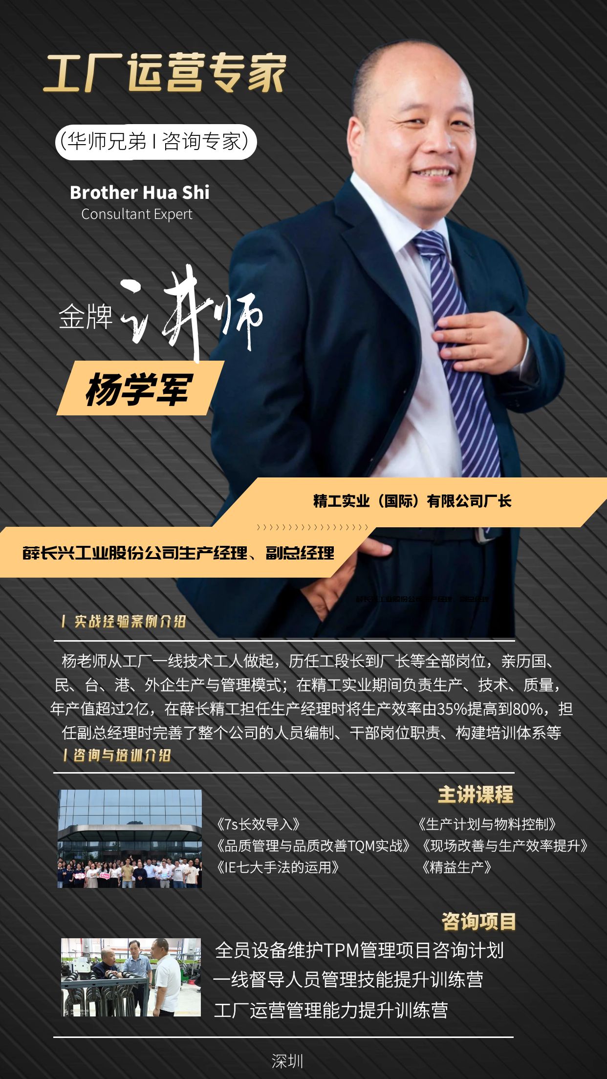 杨老师从工厂一线技术工人做起,历任工段长、班组长、车间主任、生产部经理、厂长等岗位,亲历国企、民企、台企、港企、外企生产、管理模式;20年各类制造业第一线管理咨询经历;90余家各类工厂管理改善主导;近1600场内训课程,61000人次学员参与;1000次现场巡视;1000次会议主持;10000人次一对一辅导。