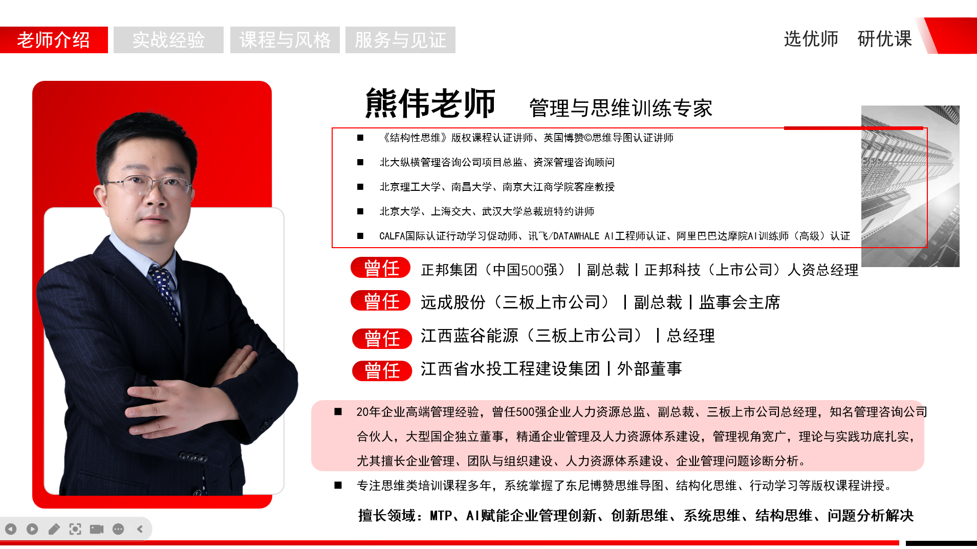 同时,熊伟老师专注思维类培训课程多年,系统掌握了东尼博赞思维导图、结构化思维、行动学习等版权课程讲授。经过多年的实战总结,熊伟老师总结了一整套丰富的思维类教学手法,擅长将管理经验与思维技术有效地结合在一起,帮助学员深刻理解、掌握各种思维技术的原理、方法和工具,培训效果得到了客户的一致好评和高频返聘。