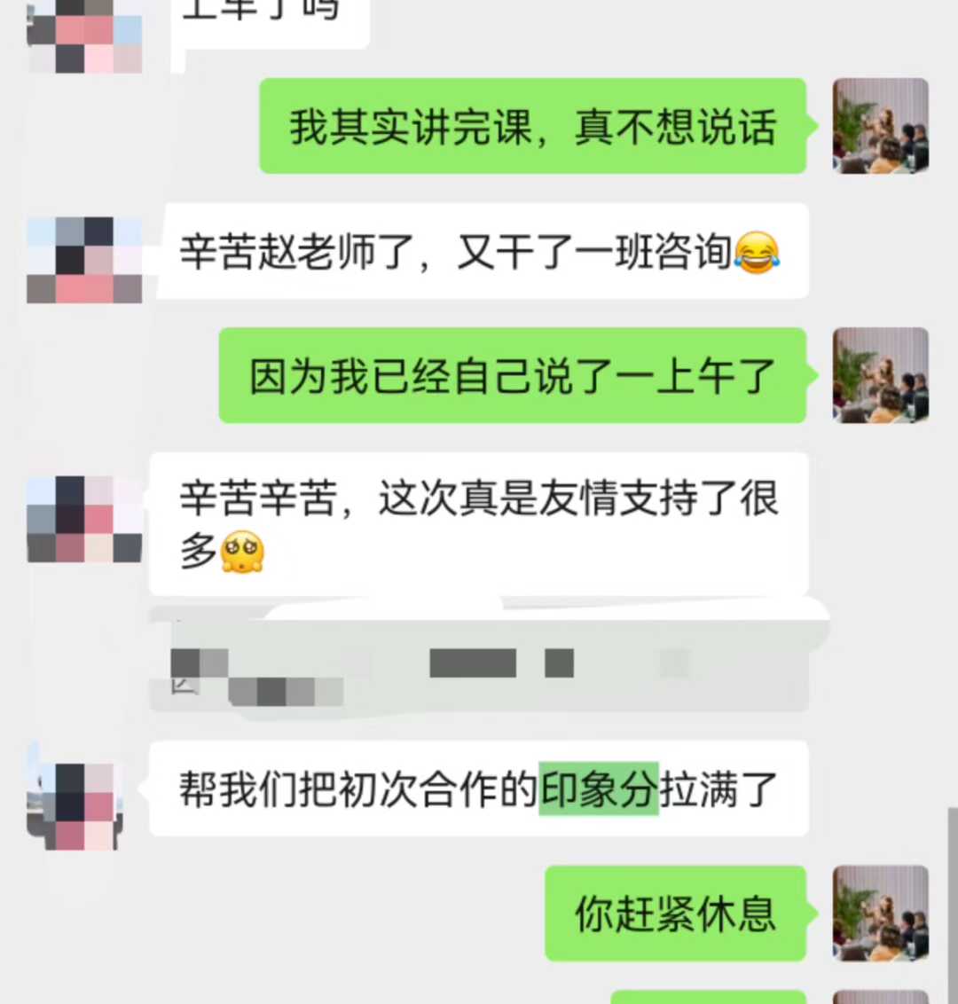 (3)曾每年为团队进行《新晋大堂经理岗前培训》、《厅堂服务营销一体化》、《厅堂沙龙营销秘籍》、《如何挑选非标固收产品》《基金销售与维护》《高净值客户的营销与维护》等课程赋能,累计150天,大大提升学员的综合技能。