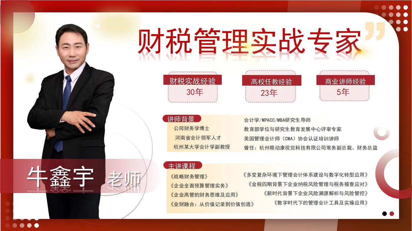 牛博士学以致用,为中国宝武集团、中国核工业集团、南方航空公司、中国移动广州分公司、中国石油四川分公司、中交广航局、中国通信服务福建公司、济南公交集团等大型国有企业,三一重工、中泰化学、龙蟒集团、骆驼股份、嘉美包装等上市公司及工商银行重庆分行、中信银行石家庄分行、华夏银行总行、中国邮储银行武汉分行等银行进行有关财税、内控及预算方面的培训和咨询服务,积累大量关于企业财税实操经验。