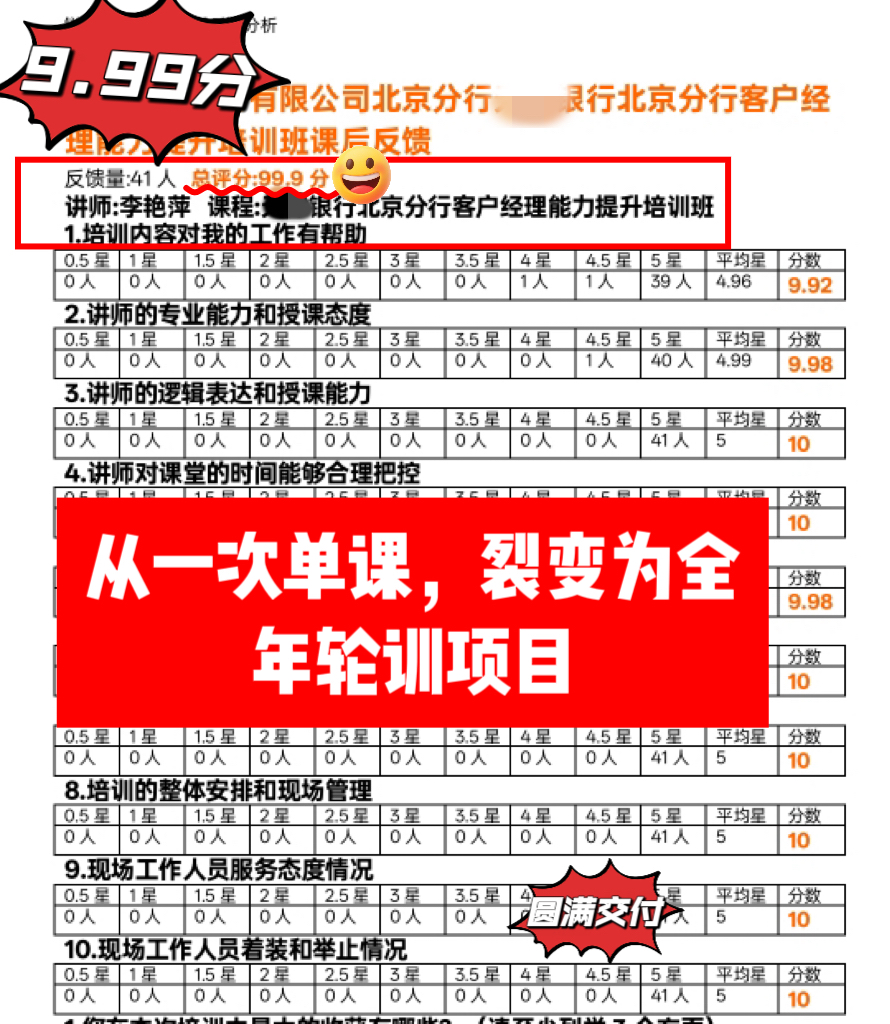 李老师曾任职于农业银行湖北分行10余年,先后从事过综合柜员、大堂经理、个人综合客户经理、对公综合客户经理、网点负责人、支行行长等职务,熟透银行对公和对私所有一线银行营销岗位,擅长以产品分层为导向的全场景营销法及客群细分为导向的全客群营销法,将自身经验融入到培训方案中,为银行赋能: